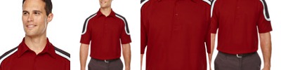 60% cotton 40% polyester performance birdseye, 5.3oz./yd2/180 gsm; Moisture wicking, antimicrobial and UV protection performance; self fabric collar with stand; color-block shoulder panels with contrast piping; side slits;