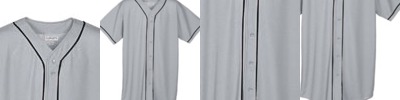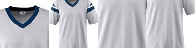 6 oz., 50% polyester, 50% cotton jersey knit; Contrast color 1x1 rib-knit V-neck collar; Contrast color sleeve inserts with accent stripes; Set-in sleeves; Double-needle hemmed sleeves and bottom;