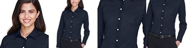 3.5 oz., 53% cotton, 43% polyester, 4% lycra; Fine yarn count shirting; True Non-iron performance straight from the dryer; stain release finish; Active Fit; Patented pucker-free taped seams; Fused collar, cuffs, and placket; Split back seam with bias cut back yoke; straight collar; pearlized buttons; front and back princess seams for a flattering feminine fit; bust darts for a flattering feminine fit;