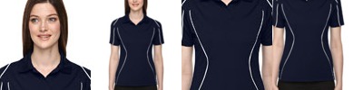 3.4 oz., 86% polyester, 14% spandex; moisture-wicking performance; contrast coverstitch details; heat-sealed label; three-button placket; back yoke; front and back princess seams;