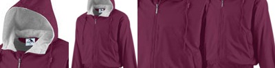 Outer shell of 100% nylon taffeta; Body,sleeves,hood: 75% polyester/13% rayon/12% cotton grey heather fleece; Water-resistant; Front zipper with inside storm flap; Hood with drawcord and sliders; Set-in sleeves for maximum mobility; Reinforced slash front pockets with zippers; Elastic cuffs and bottom; Woven label;