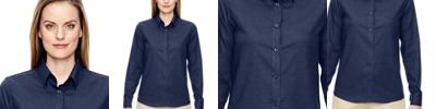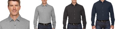 60% cotton/40% polyester, 3.5 oz./yd2/120 gsm; Wrinkle resistant finish; yarn-dyed checkered dobby twill; hidden button-down collará; double needle flat felled side and underarm seams; adjustable cuffs; back yoke; back waist darts;