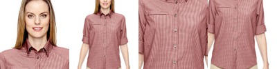 4.2 oz., 70% rayon/30% polyester mini check; moisture-wicking; hidden button-down collar; back vent system for added breathability; right-chest pocket with reverse coil semi-autolock zipper and rubber pull tab ; durable flat felled side and underarm seams; adjustable cuffs can be worn down or rolled up;