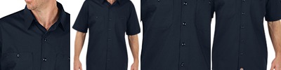 - stain-release; Dickies logo on side of chest pocket and bottom of button placket